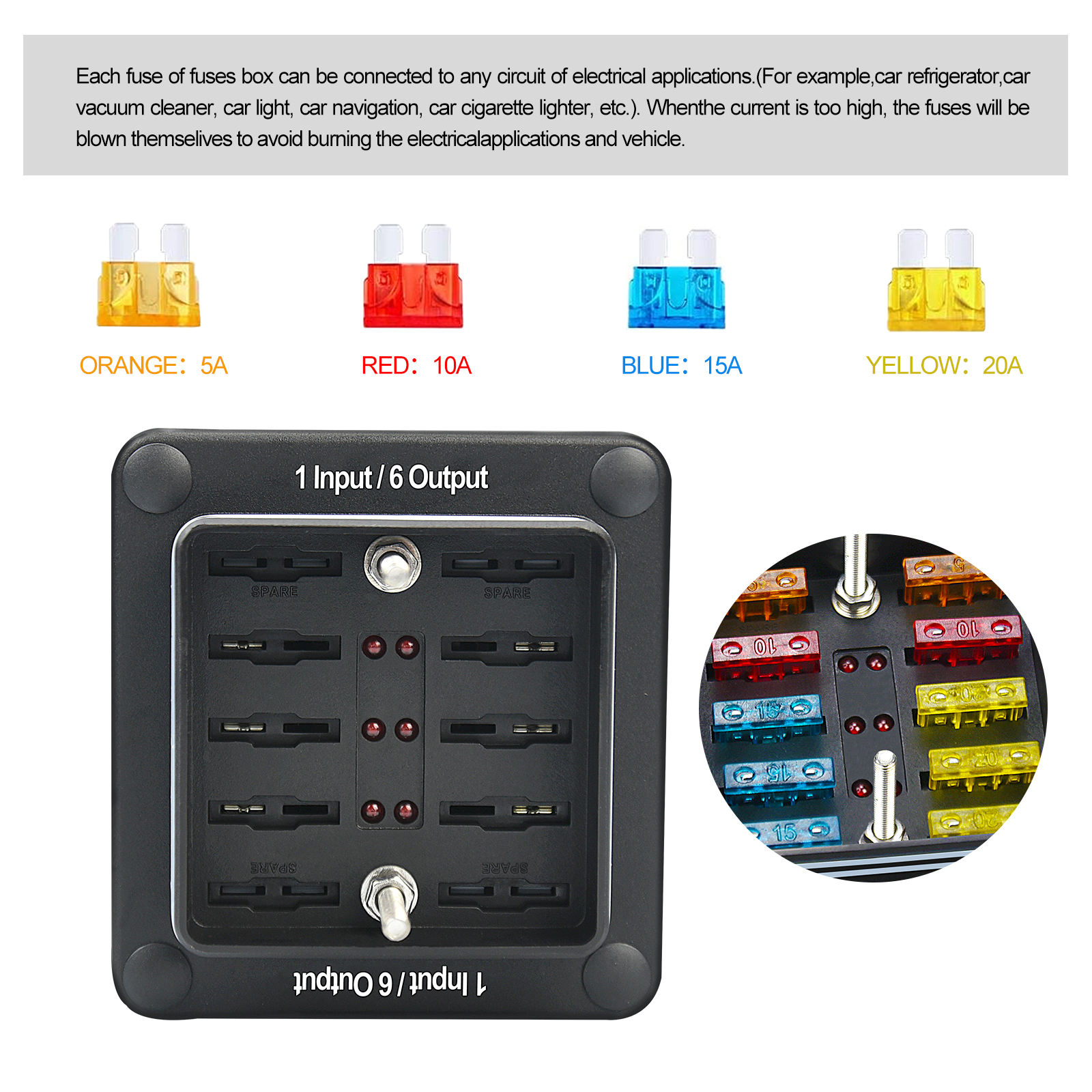 EL-1858A1 6-Way Independent Control Circuit Breaker Automotive Accessory Mega Battery Fuse Holder Plastic One in Multi Out